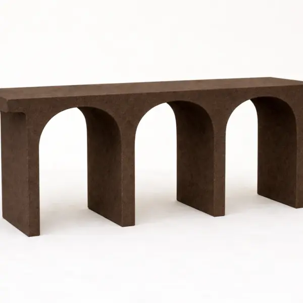 The Ruth Console reflects these values through its architectural form of repeated arches supporting a refined horizontal surface. The rhythmic structure creates a powerful sense of balance between strength and openness, grounding the design while allowing light to move freely through it. Crafted in hand-applied microcement, the piece carries a timeless presence that feels both monumental and elegant.